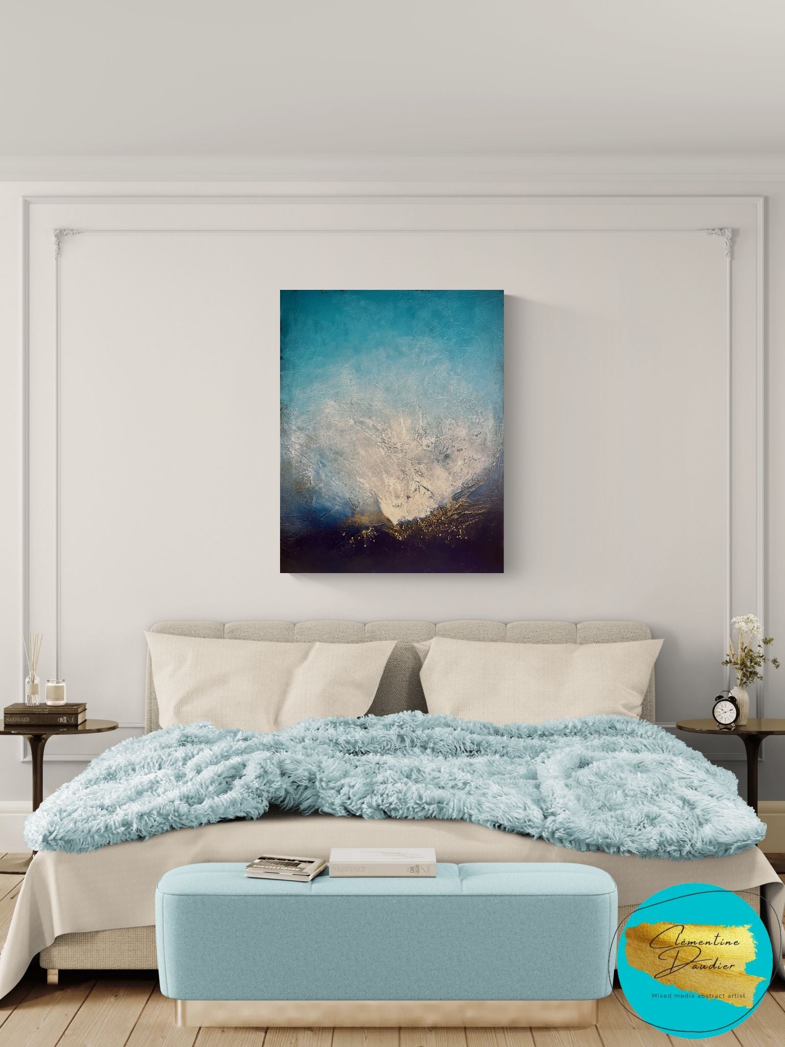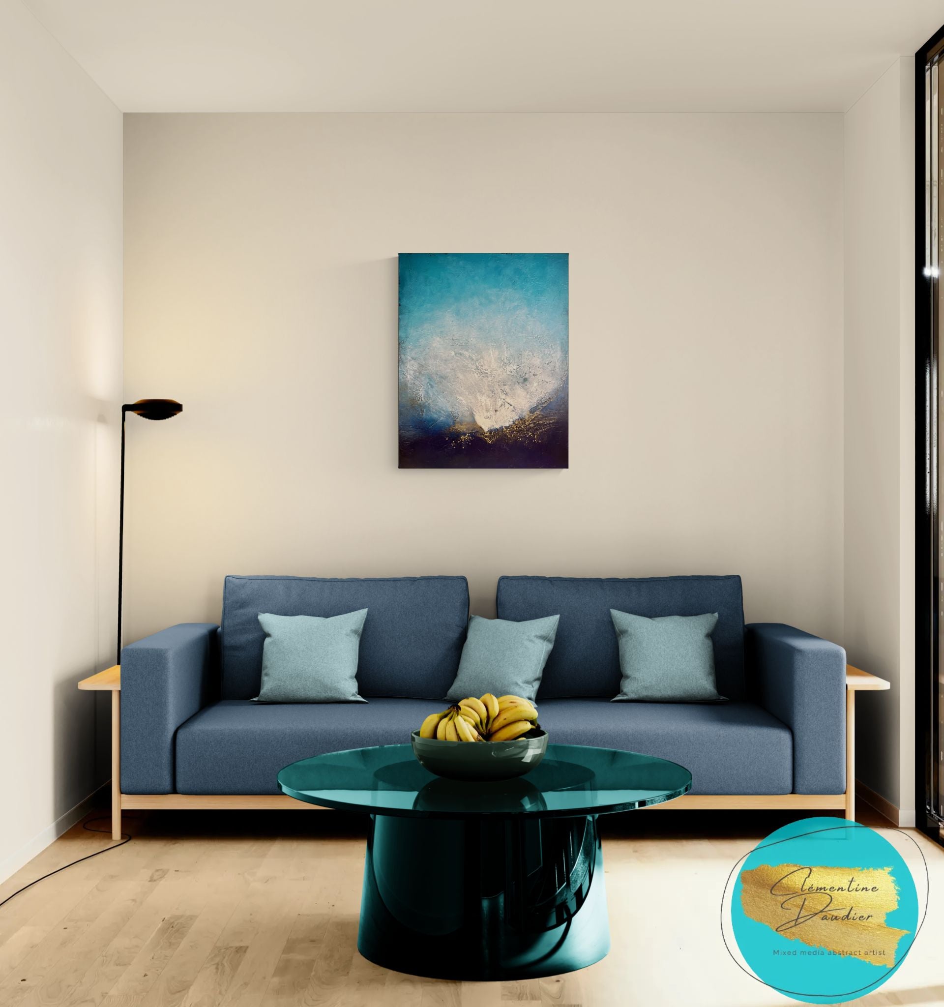 Allow this canvas to become your personal sanctuary, where stress gently ebbs away like cortisol fading at tide's retreat, your heartbeat slows to the sea's lullaby, and waves of dopamine bring a soft, enduring joy that science calls Blue Mind healing, delivered daily from your wall alone.