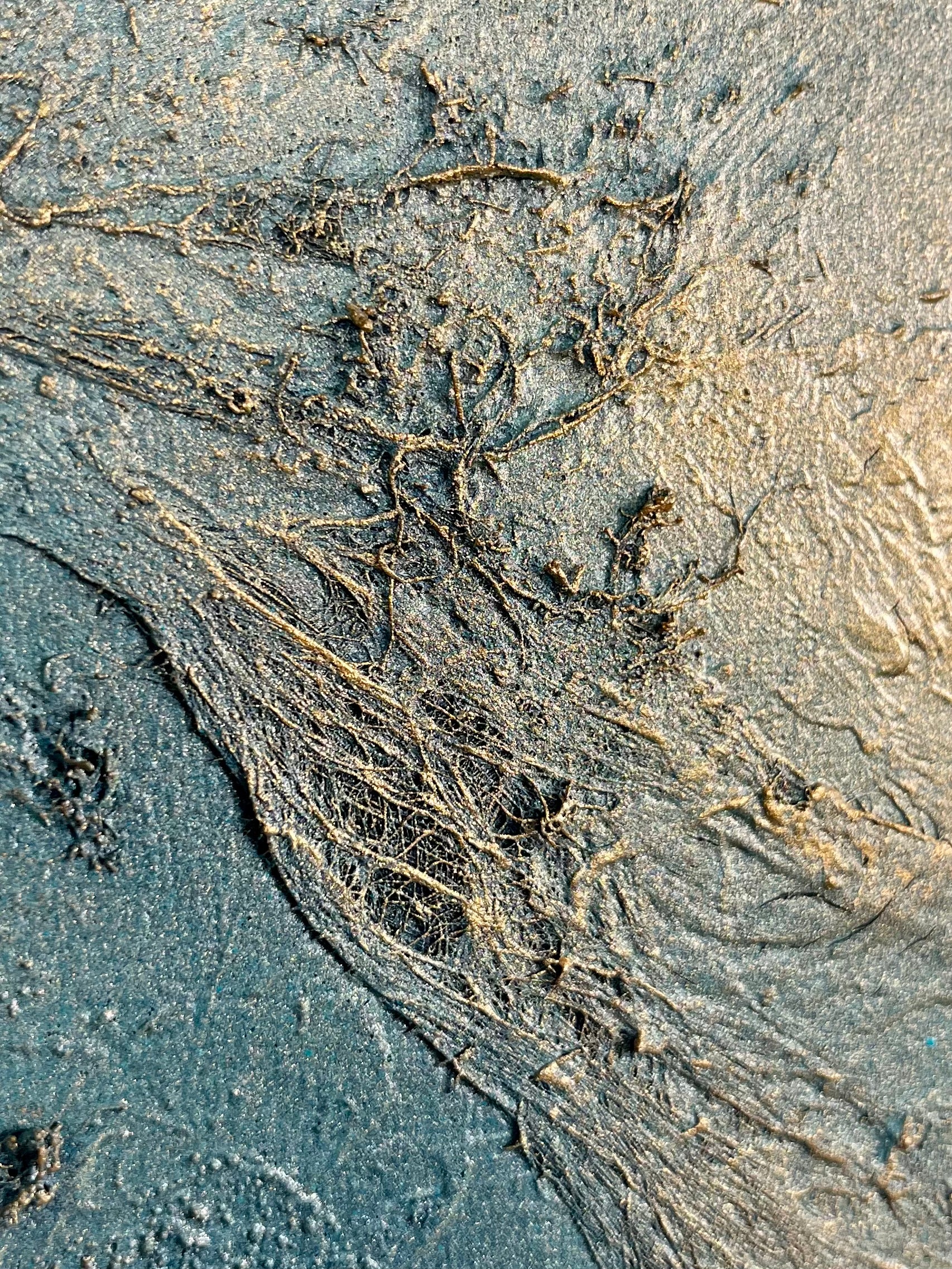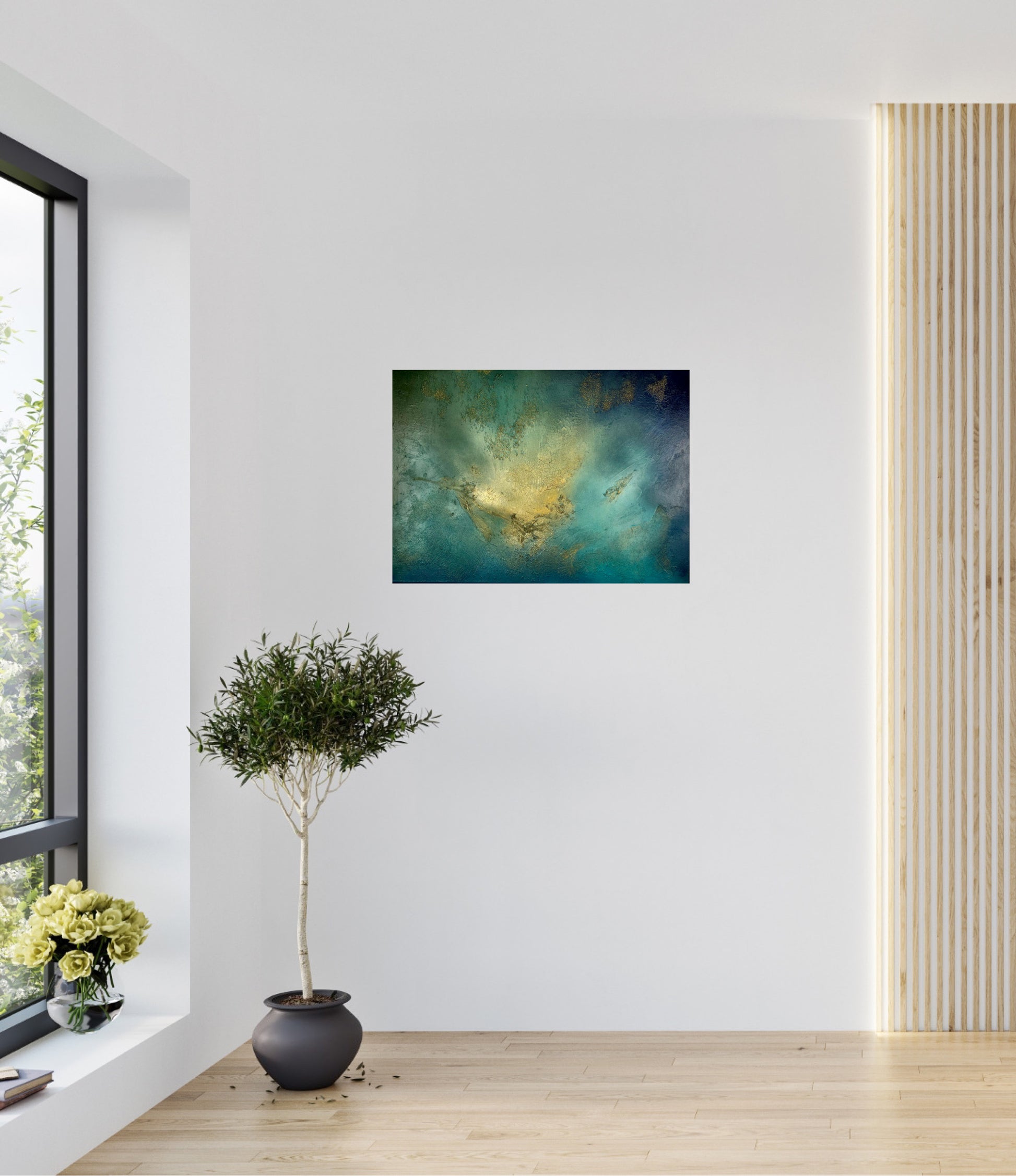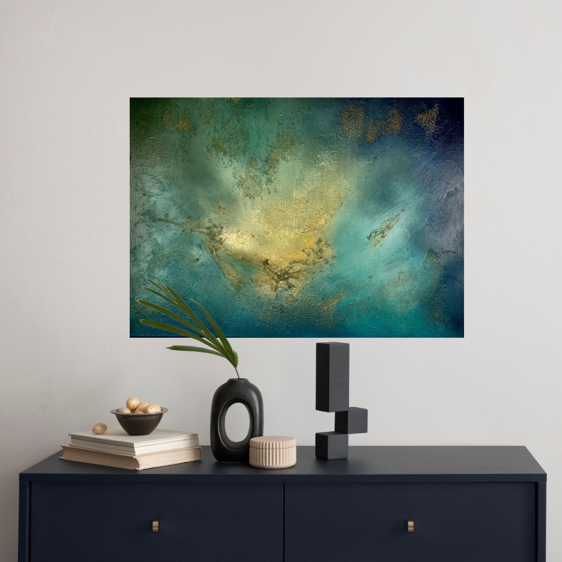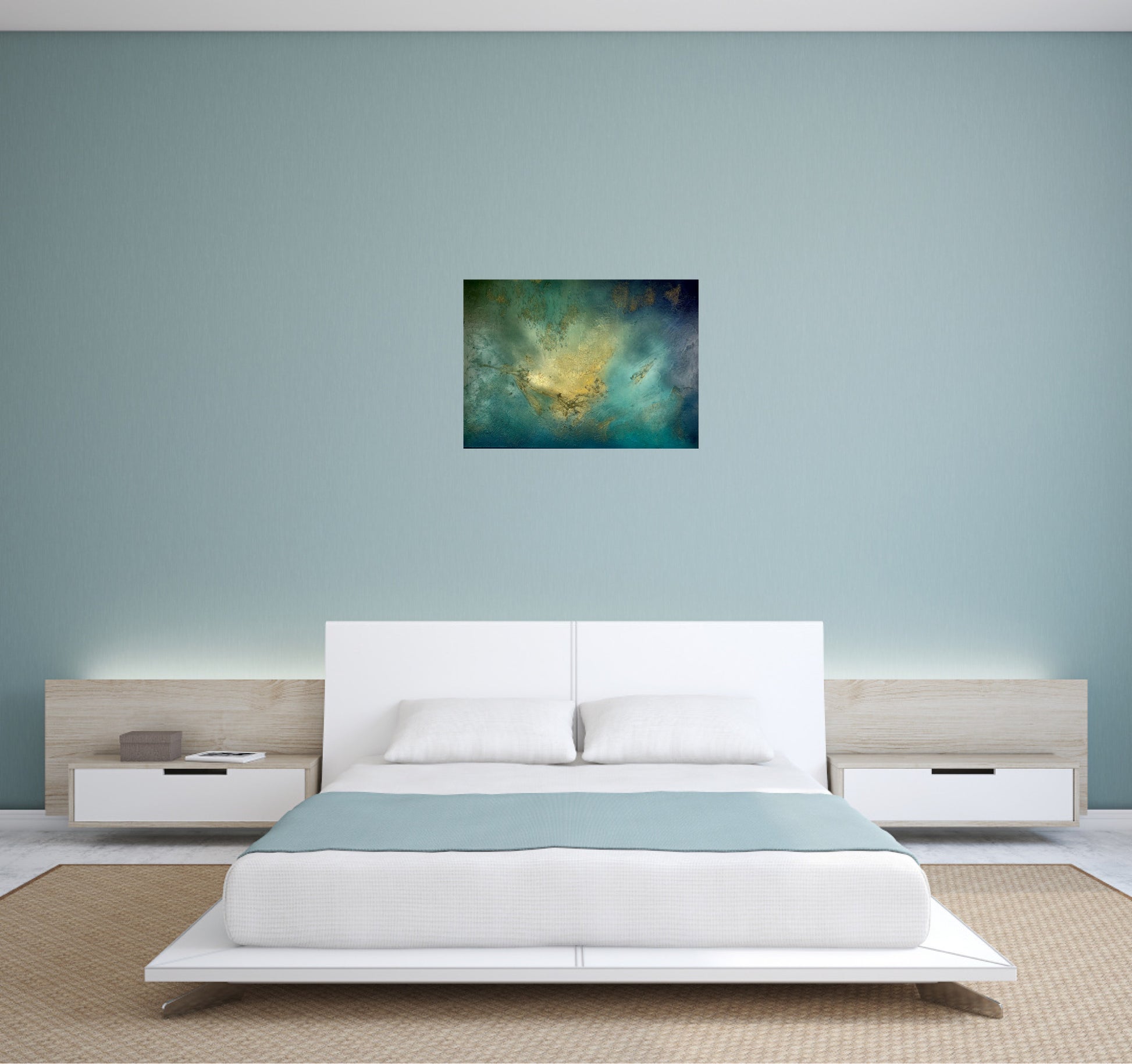 This artwork has a lot of different textures, with which I played to create an imaginary dramatic sky, where the heavy clouds give way to the sunlight, exploding and radiating in its golden glory.