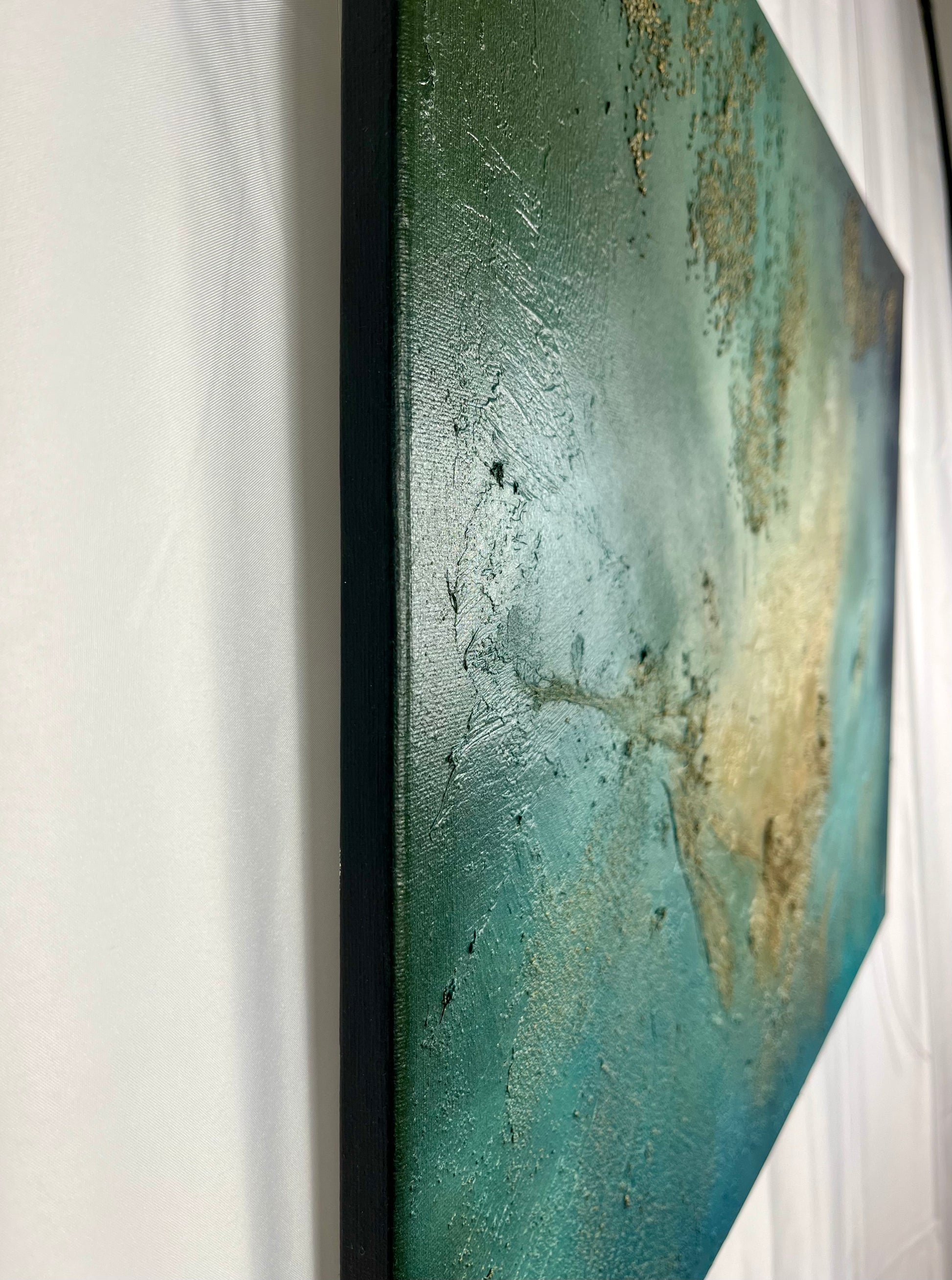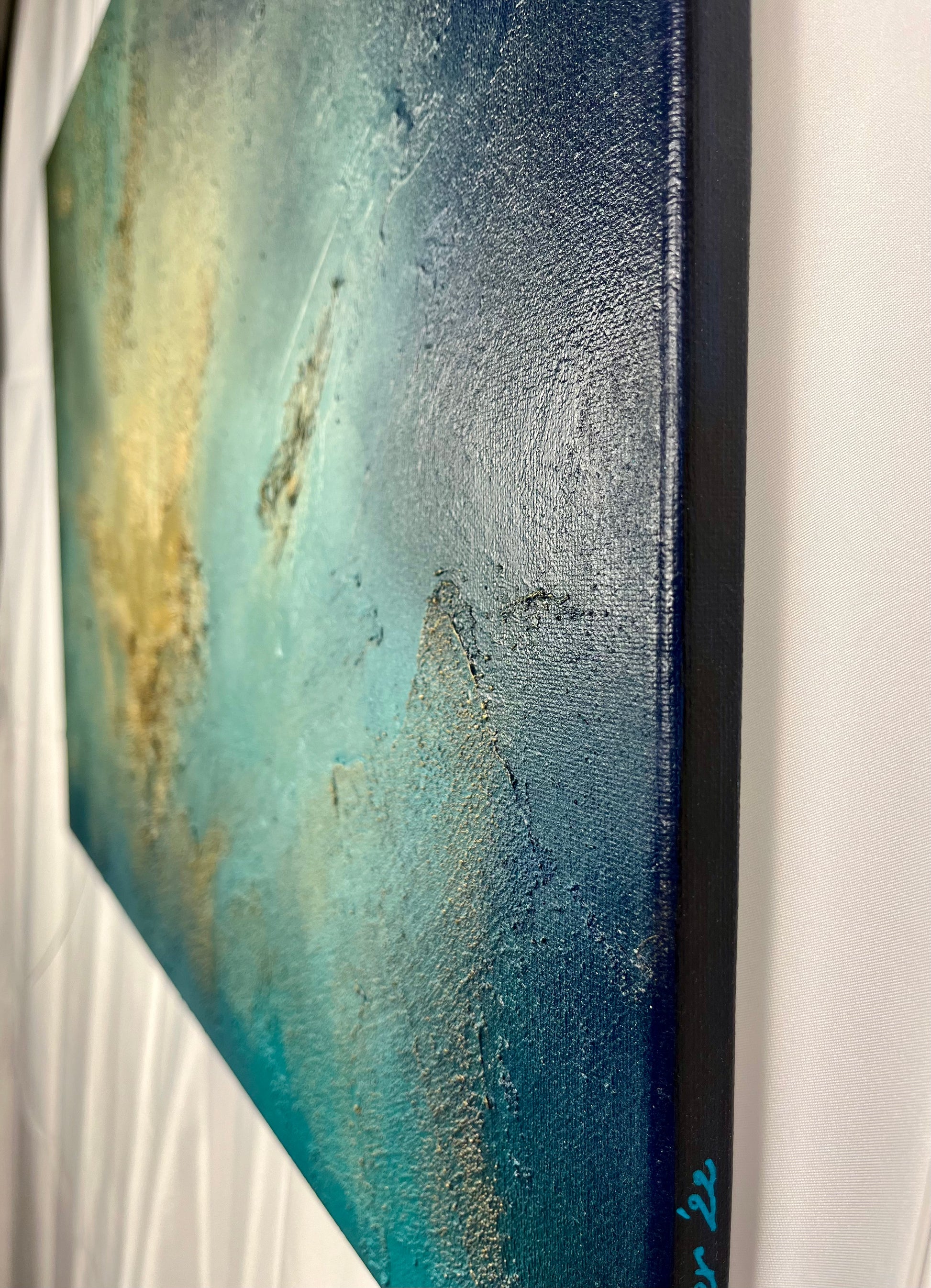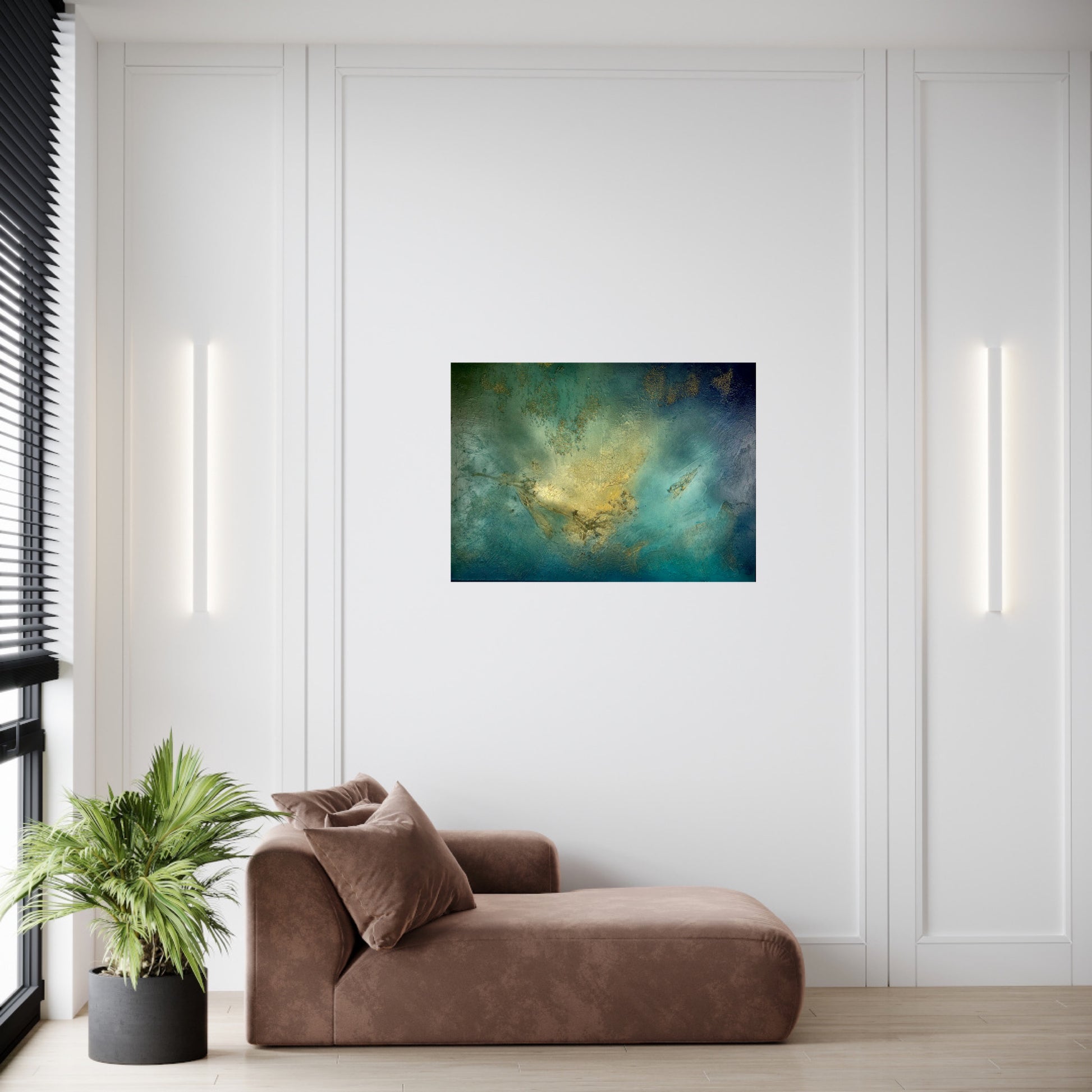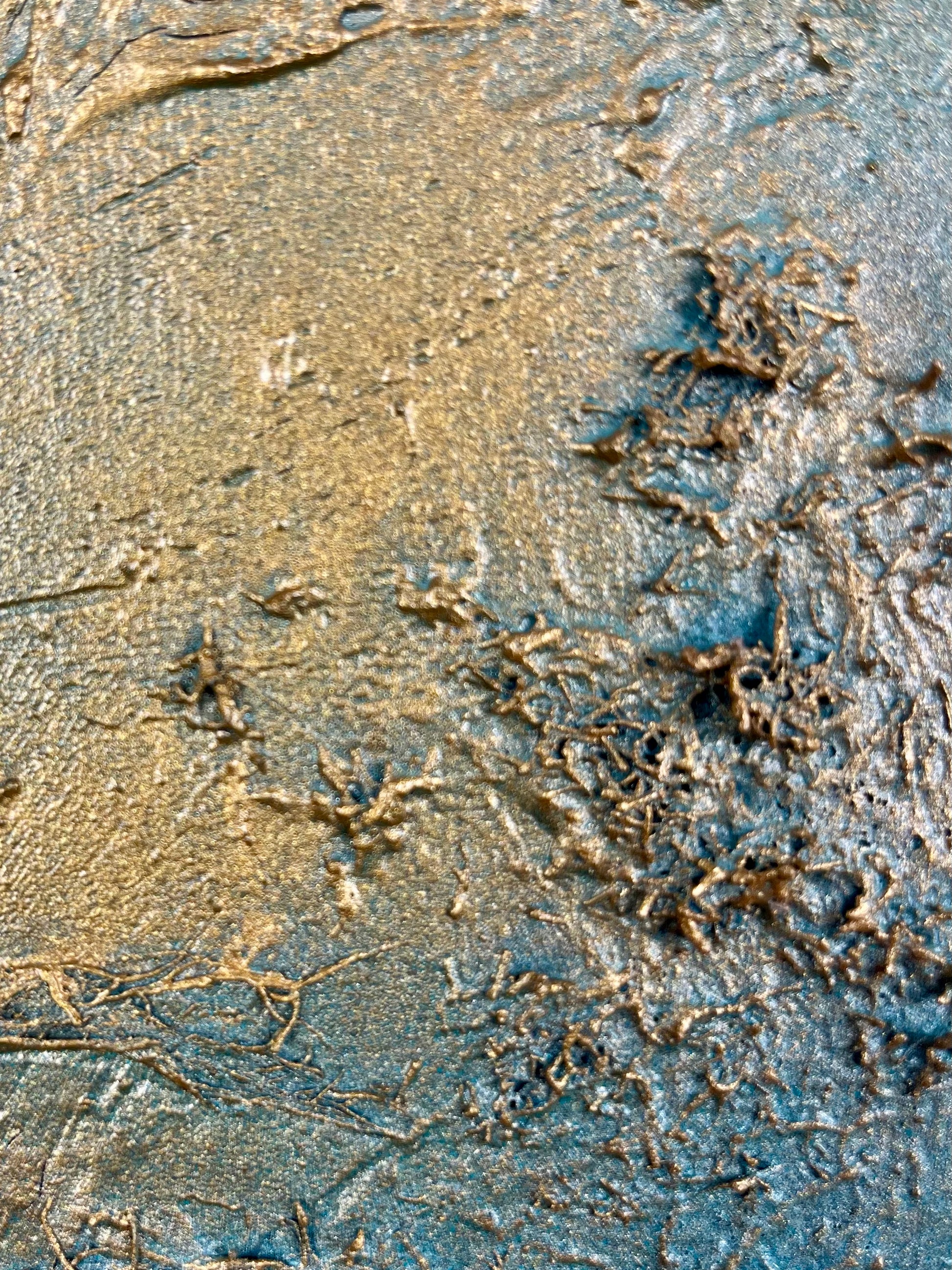 This artwork has a lot of different textures, with which I played to create an imaginary dramatic sky, where the heavy clouds give way to the sunlight, exploding and radiating in its golden glory.