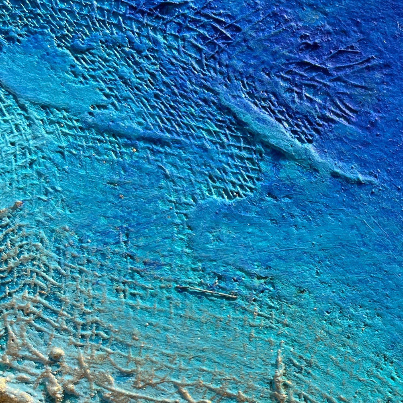 Created on a deep edge canvas with finished sides, it’s ready to hang without a frame, adding contemporary depth to any wall. Inspired by coastal healing and Kintsugi philosophy, its shimmering beads and patina shift with light, inviting daily calm and Blue Mind therapy.