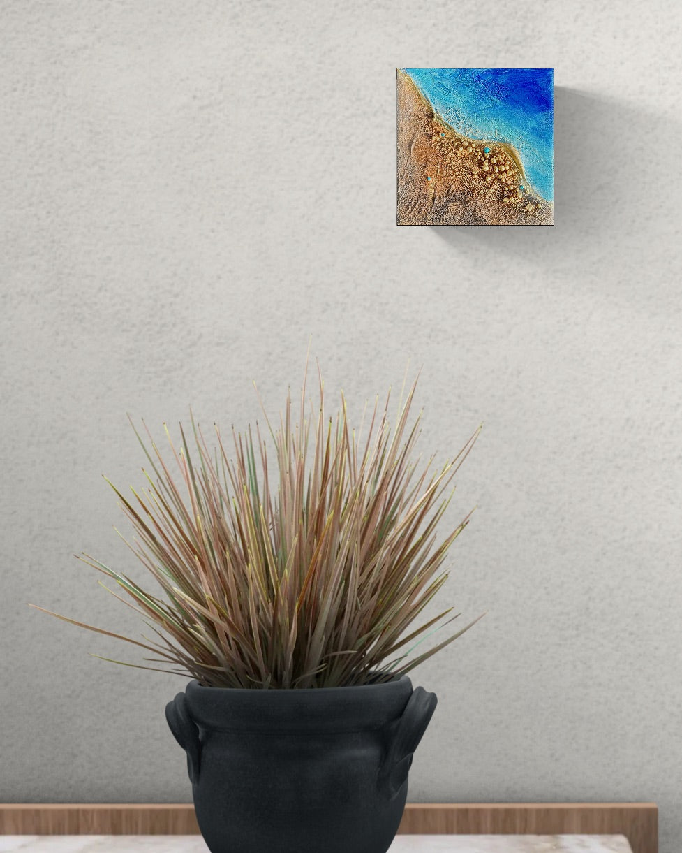 Elevate your space with Elemental Mini I, a compact 15x15cm mixed media from my Elemental collection. This original abstract painting captures the serene meeting of golden sandy shores and turquoise ocean waves, using real rust and tactile textures for a sculptural effect.