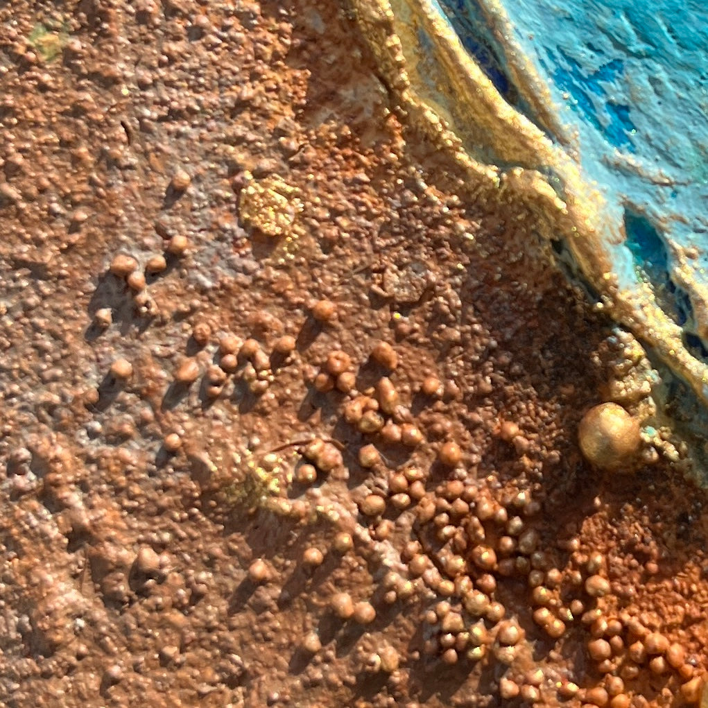 • Materials: Mixed media with real rust, acrylic paint, textured elements