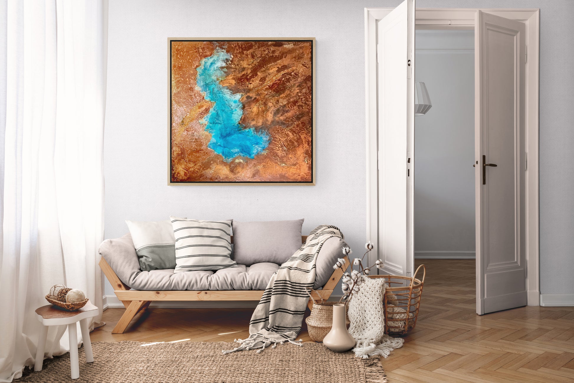 Measuring 100 x 100 cm, this piece is framed in a natural light wood floating frame and evokes a mineral, sacred landscape — part map, part memory, part relic. The use of rust, gold beads, and metallic textures creates a tactile dialogue between erosion, transformation, and elemental beauty.