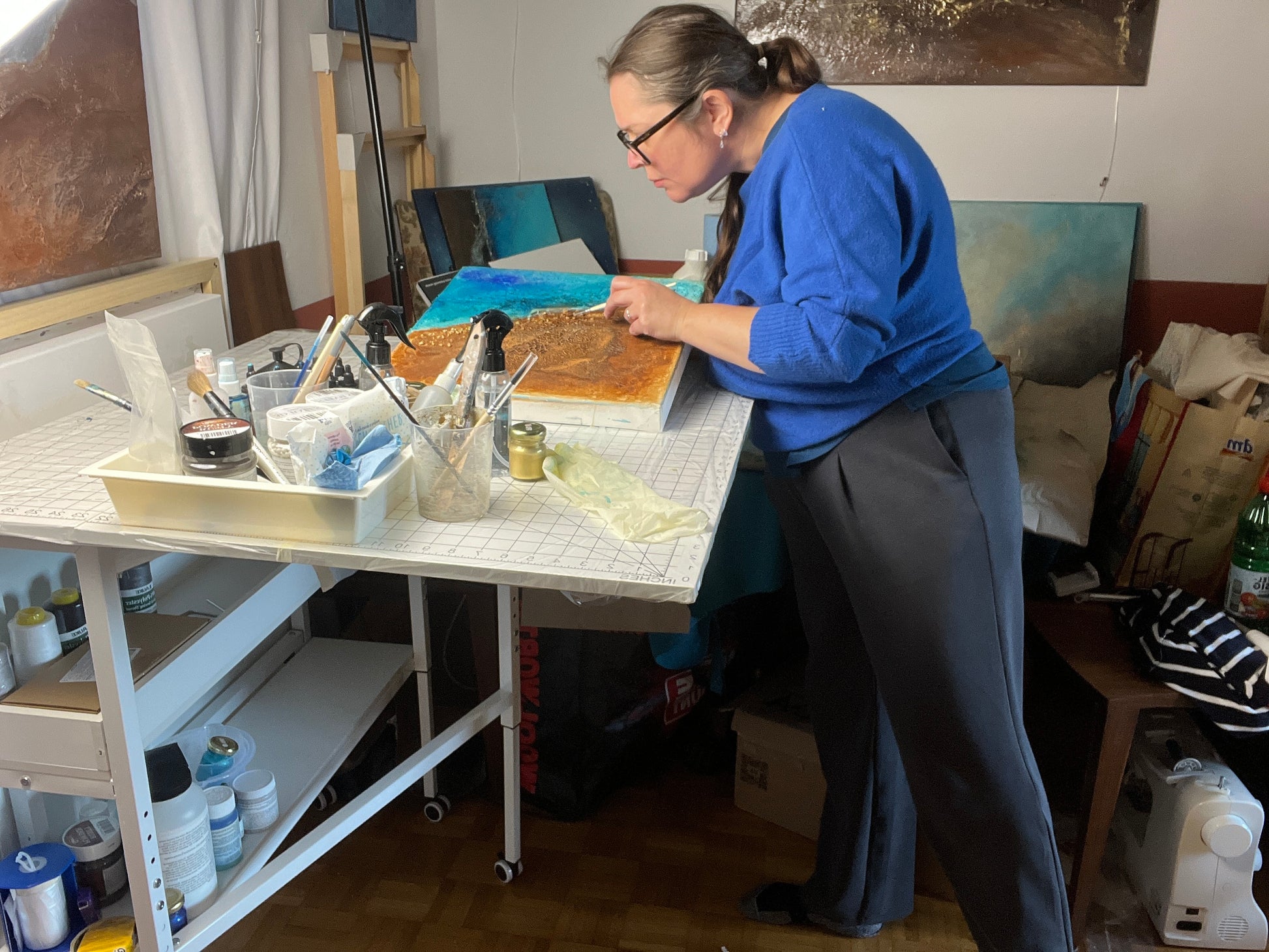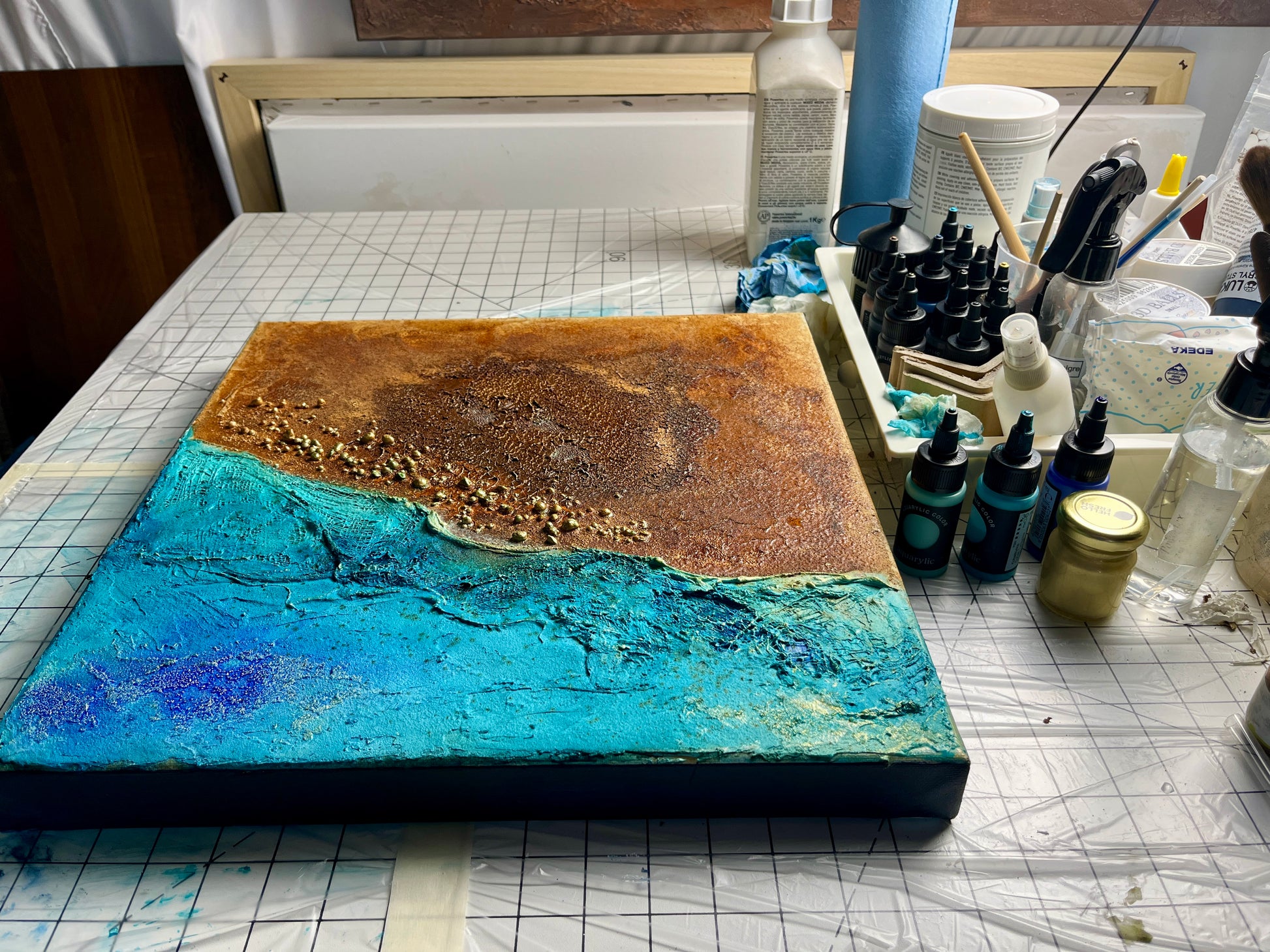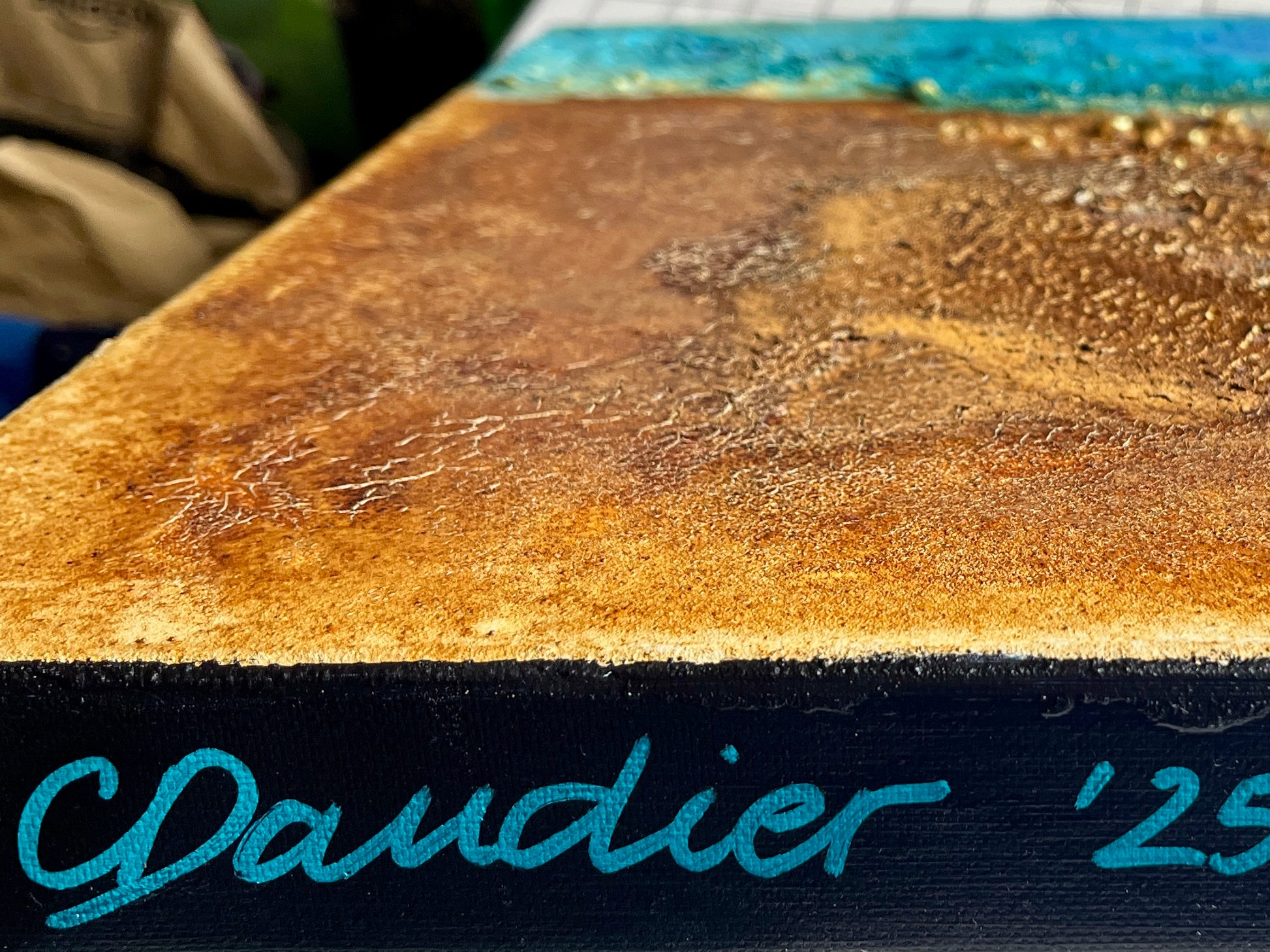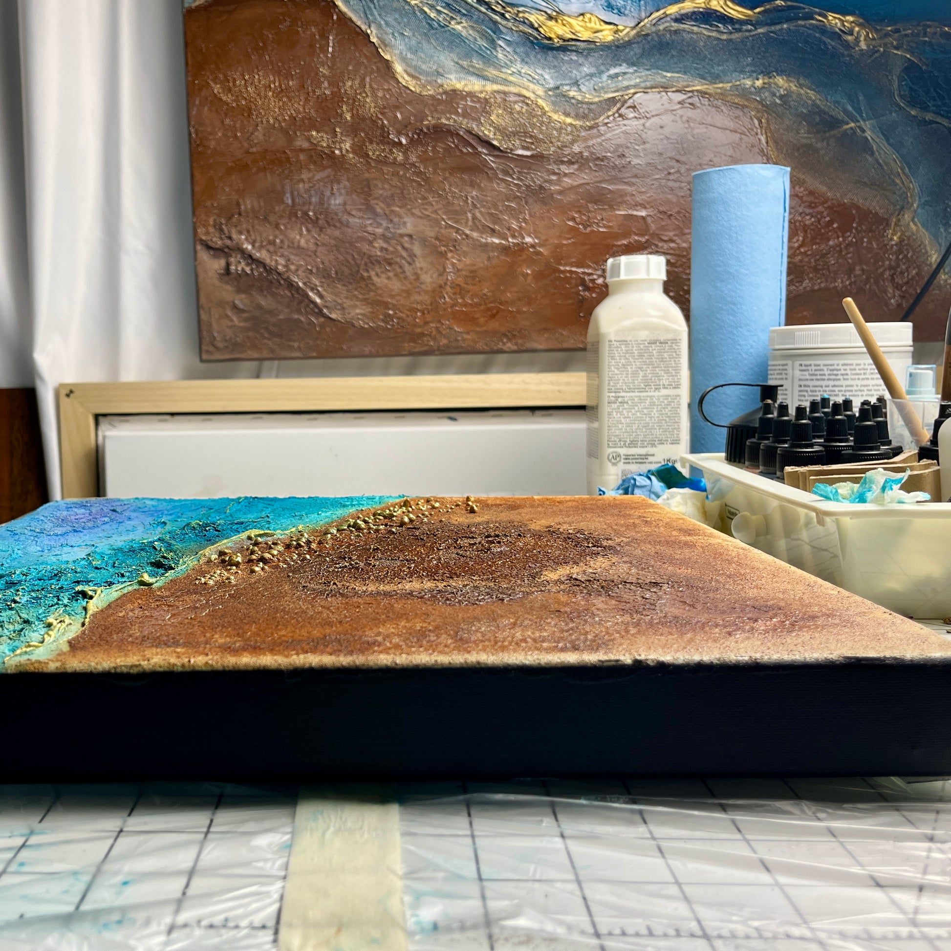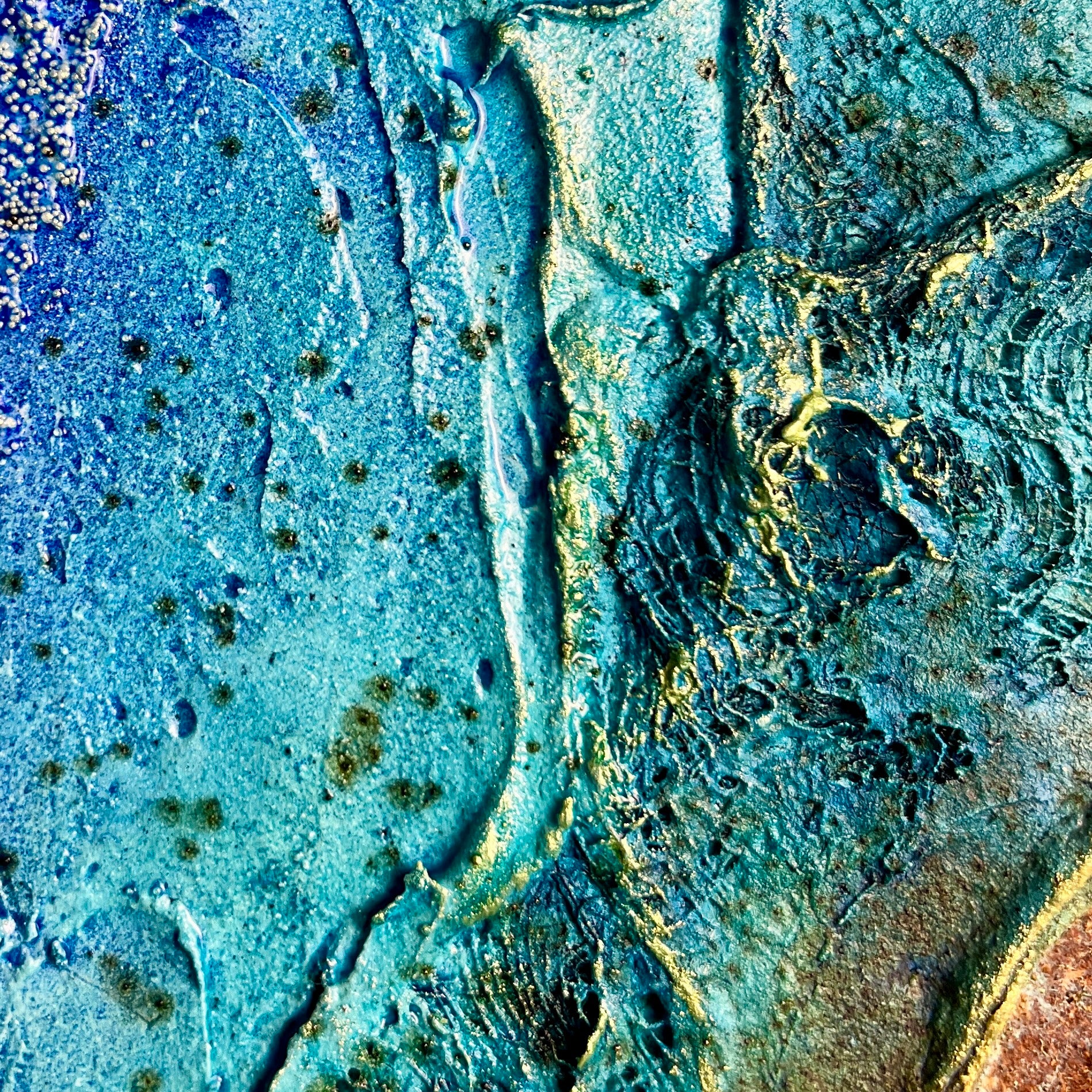 - Materials: Acrylic, pigments, texture mediums, fabric, rust