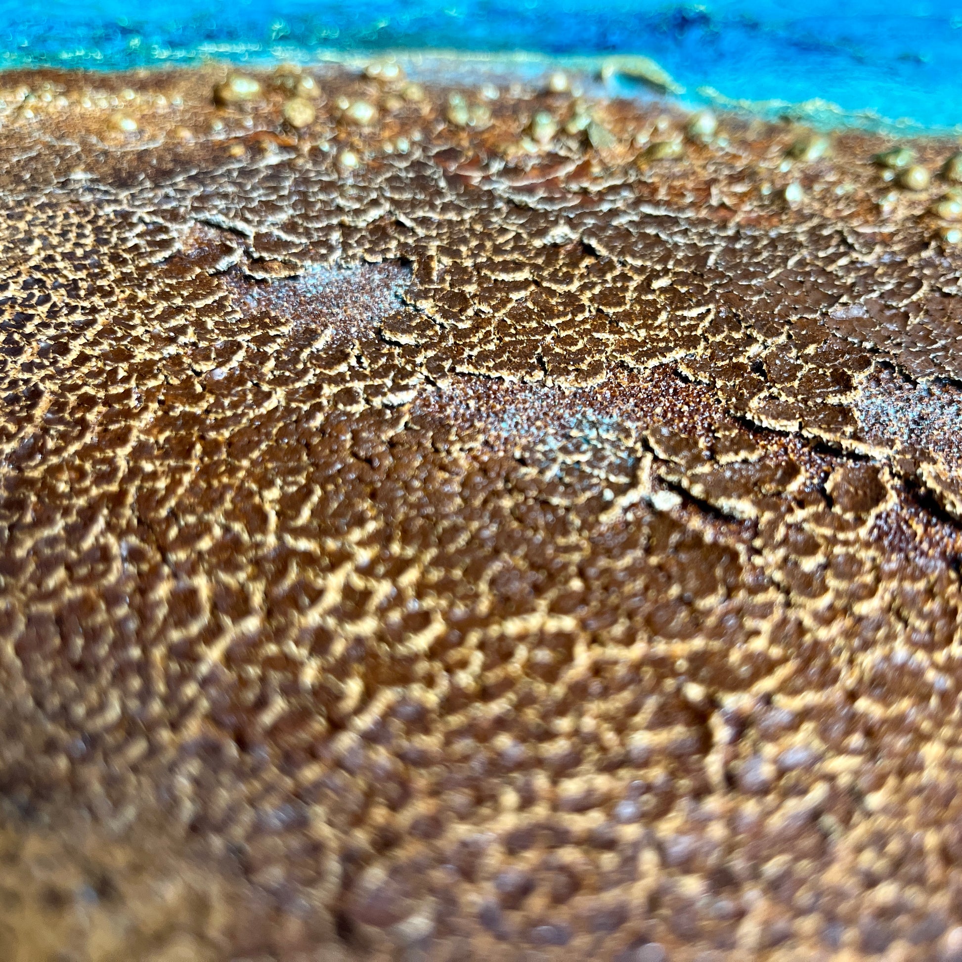 Dominated by deep, immersive blues, the composition is enriched with soft golden highlights and refined shades of rust, carefully worked to reveal a poetic, time-worn texture. These natural tones ground the piece and evoke a sense of serene strength. The layered surface evolves with the light, creating a living artwork that shifts with your space and your day.