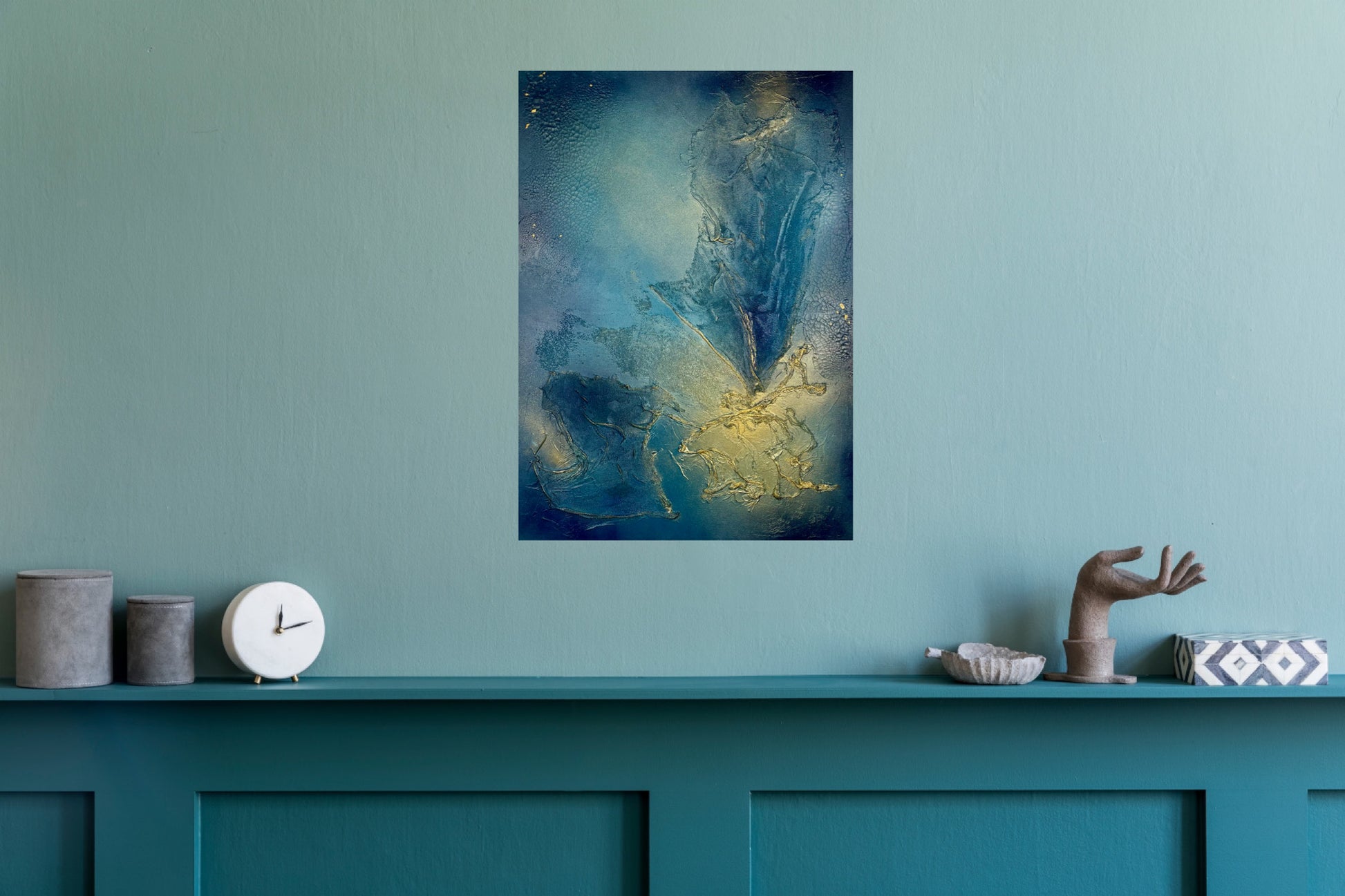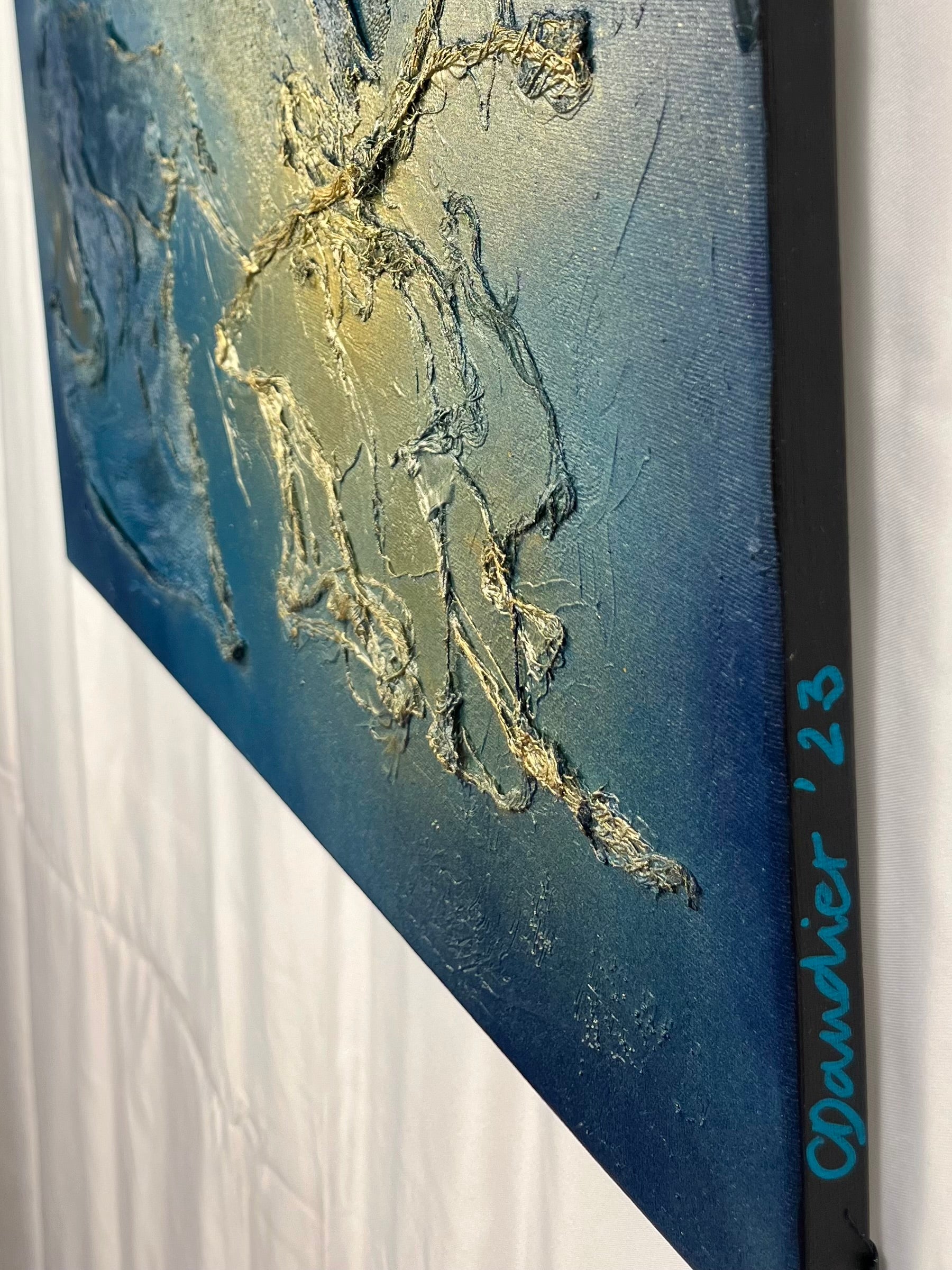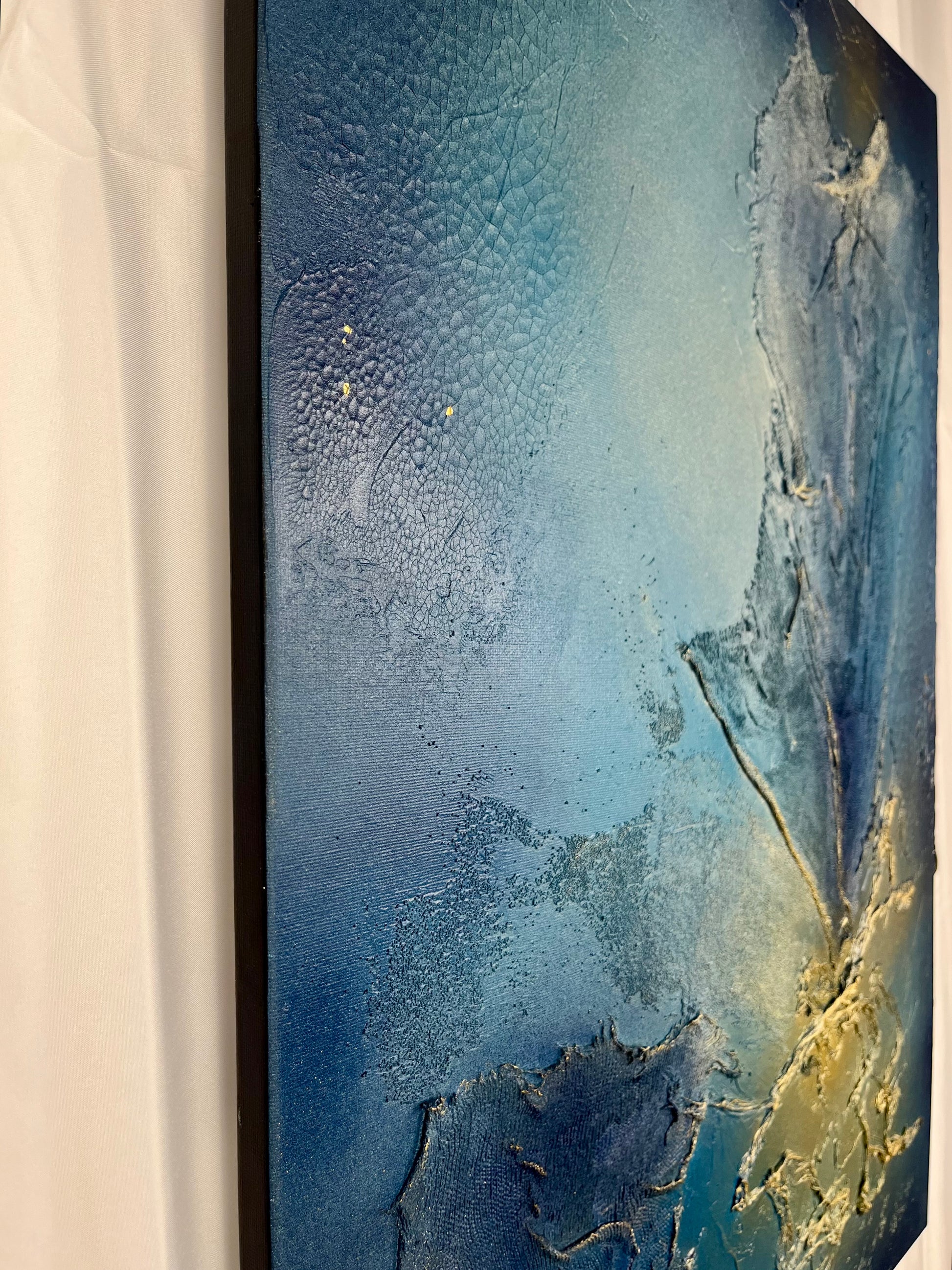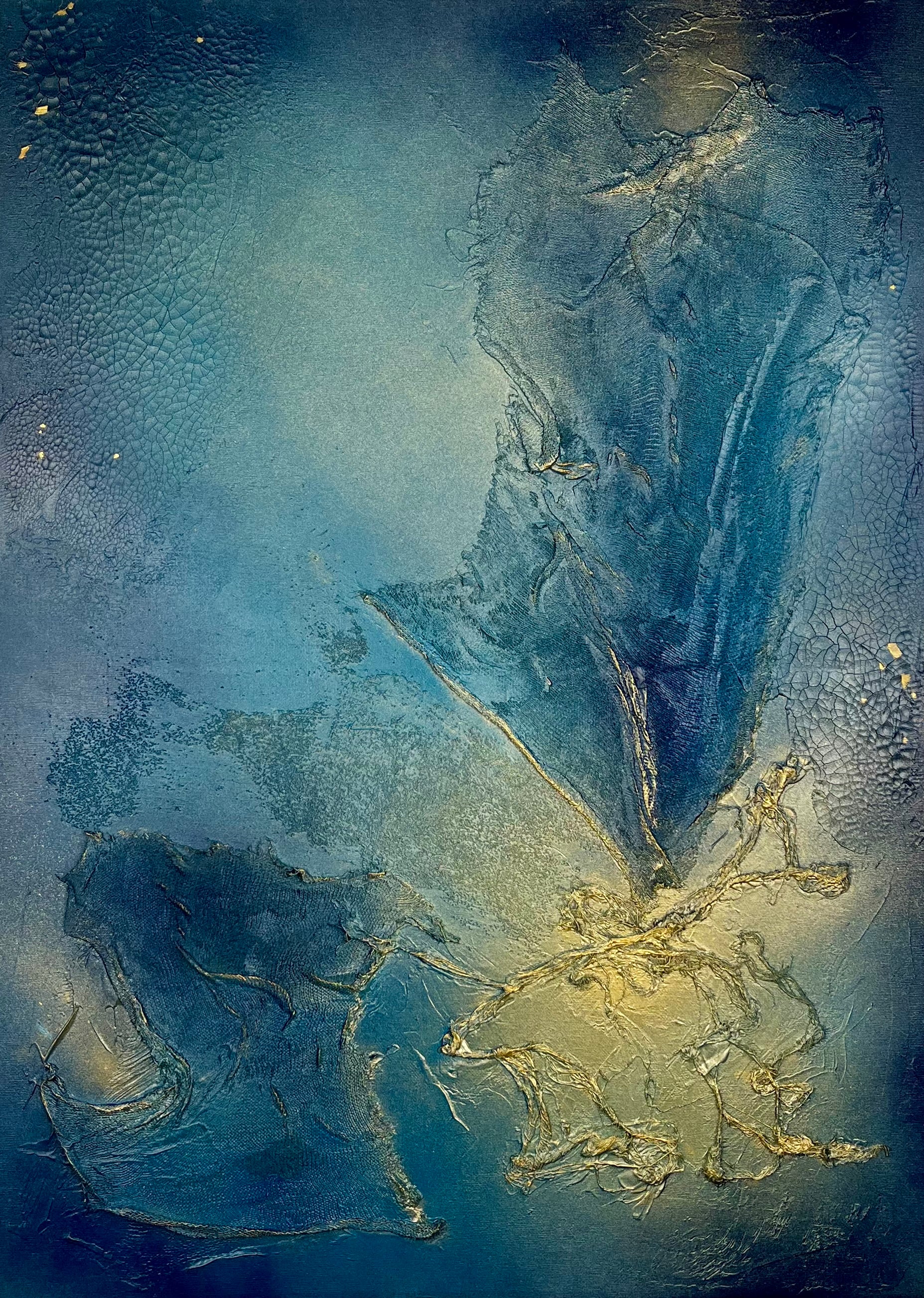 An ethereal artwork, which evokes movement and light, maybe an angel. A spiritual and relaxing piece featuring varied textures and golden highlights on deep blues.