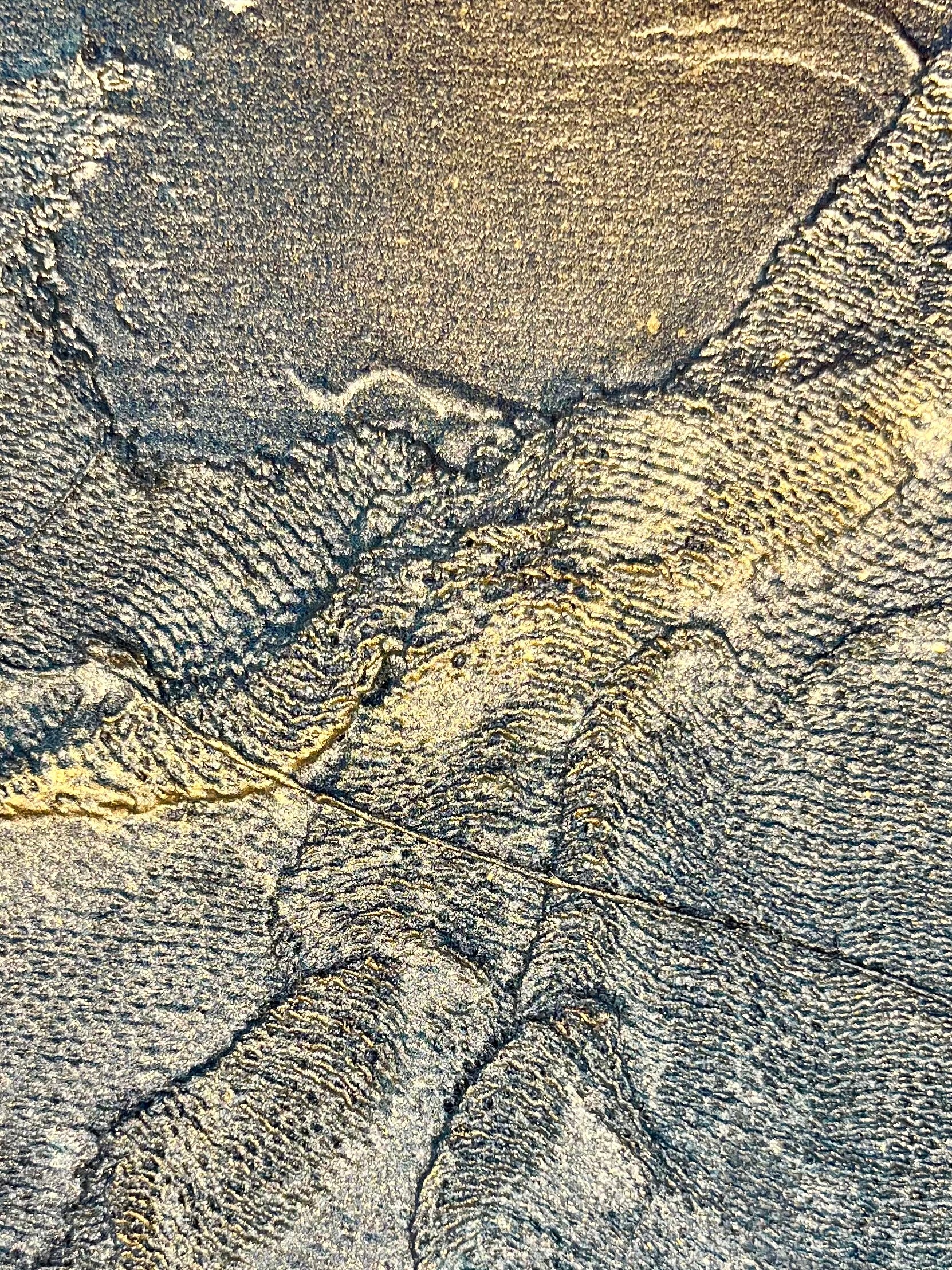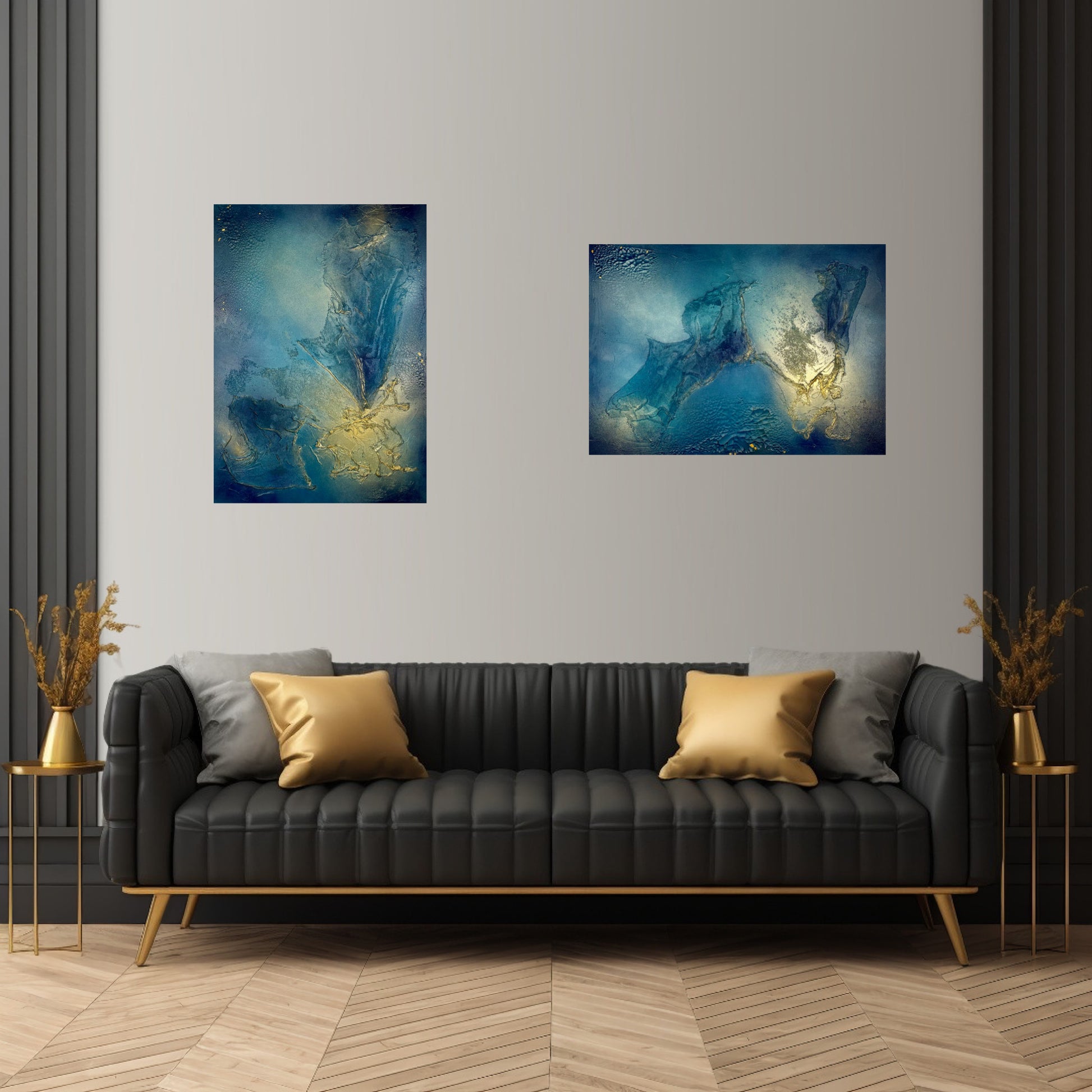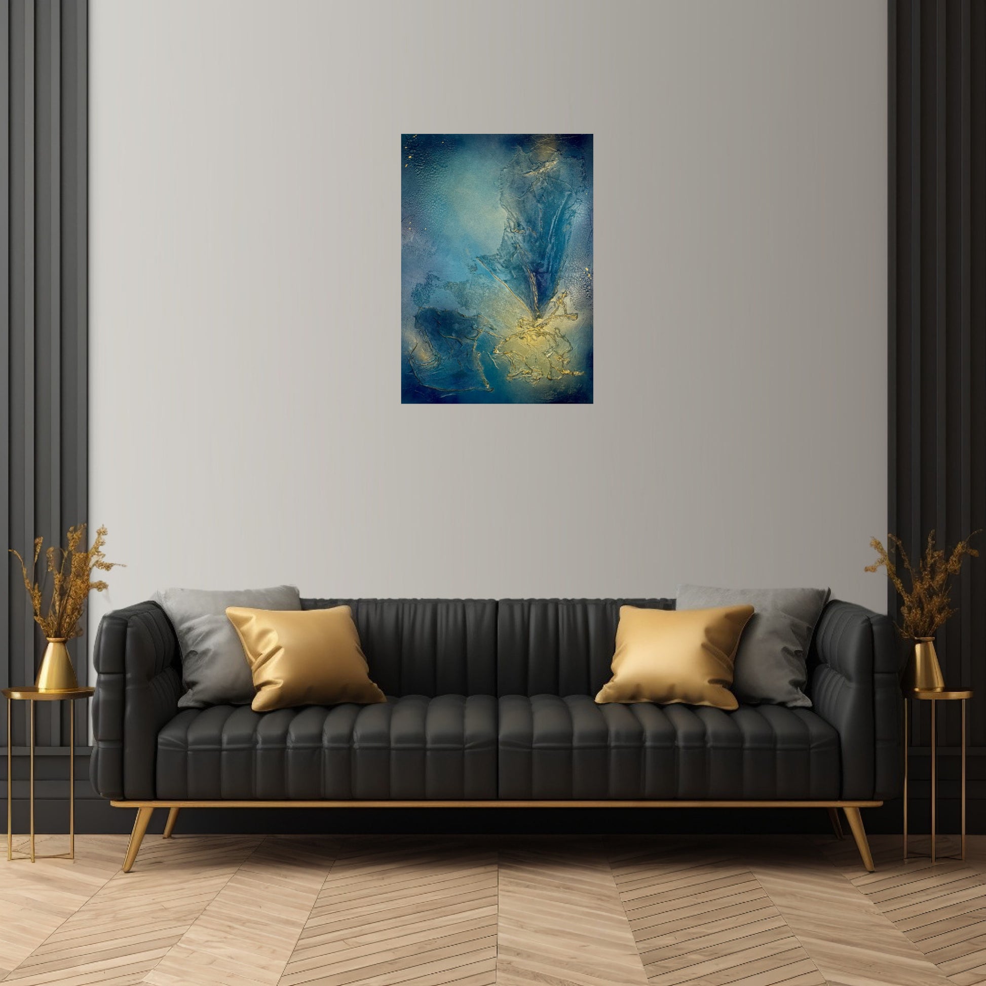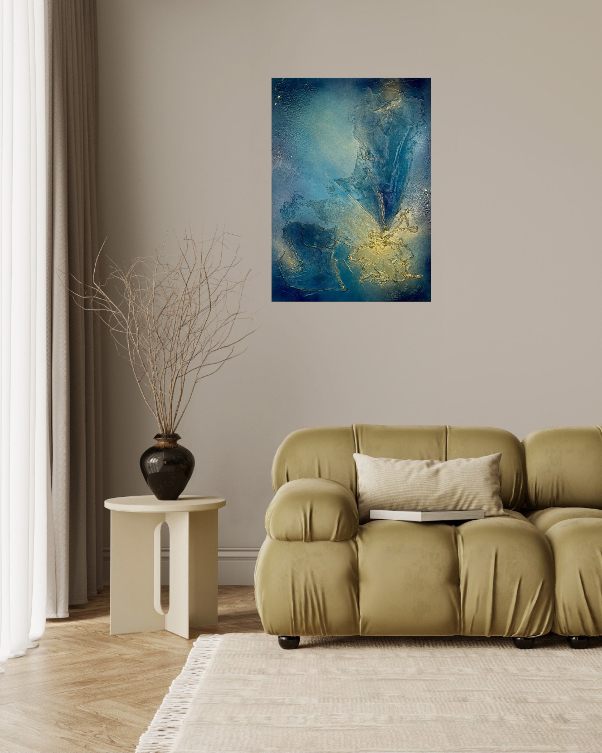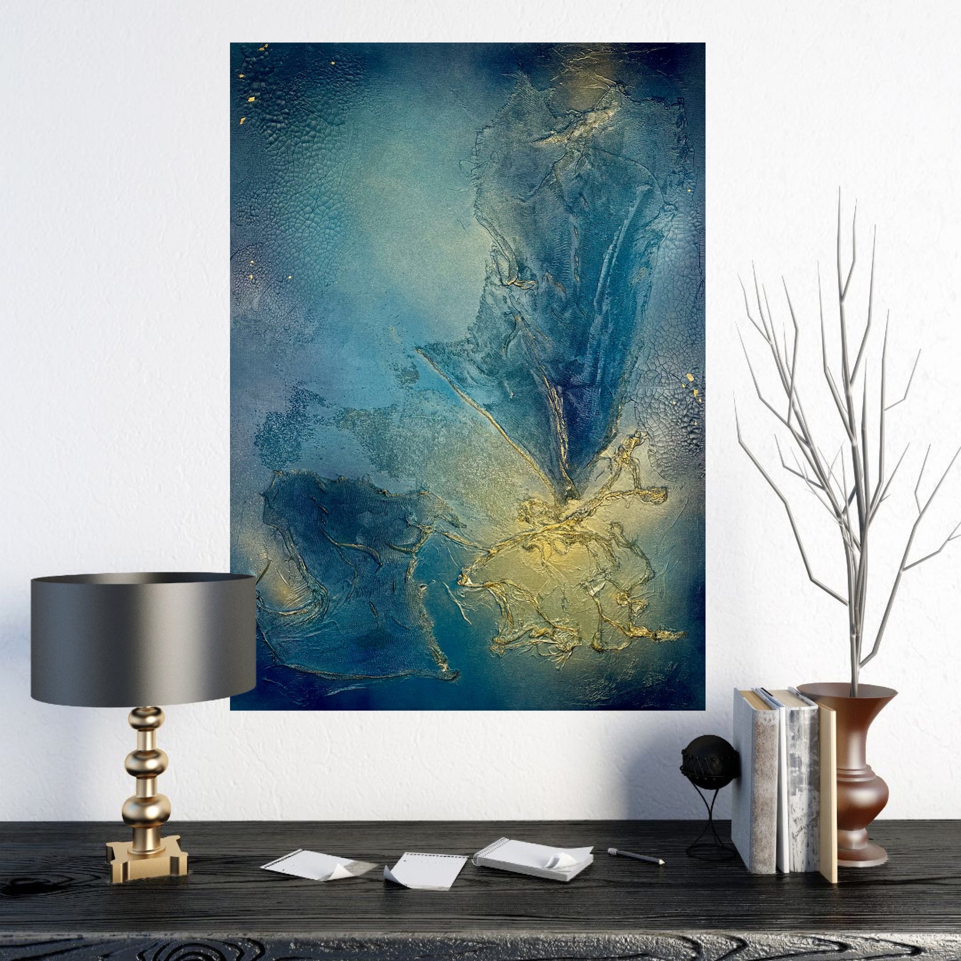 An ethereal artwork, which evokes movement and light, maybe an angel. A spiritual and relaxing piece featuring varied textures and golden highlights on deep blues.