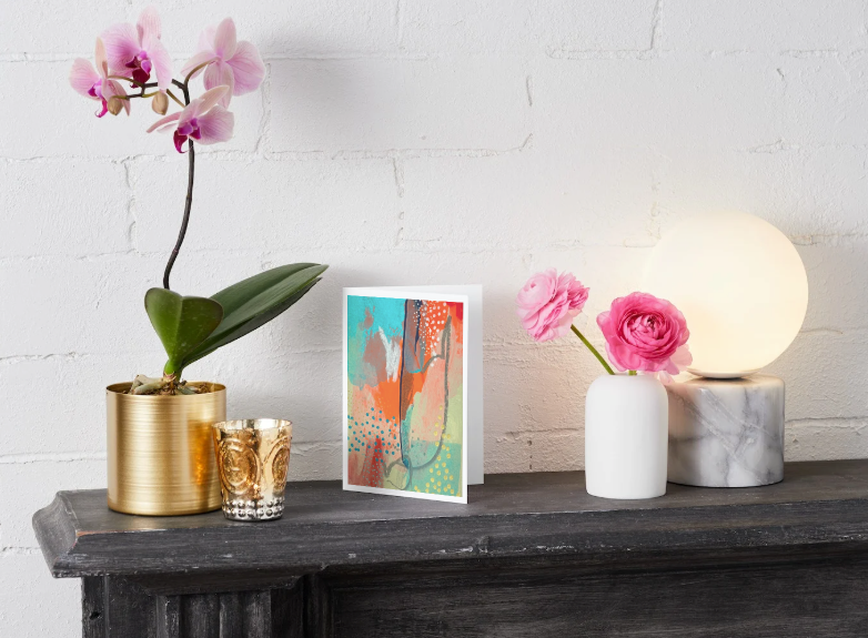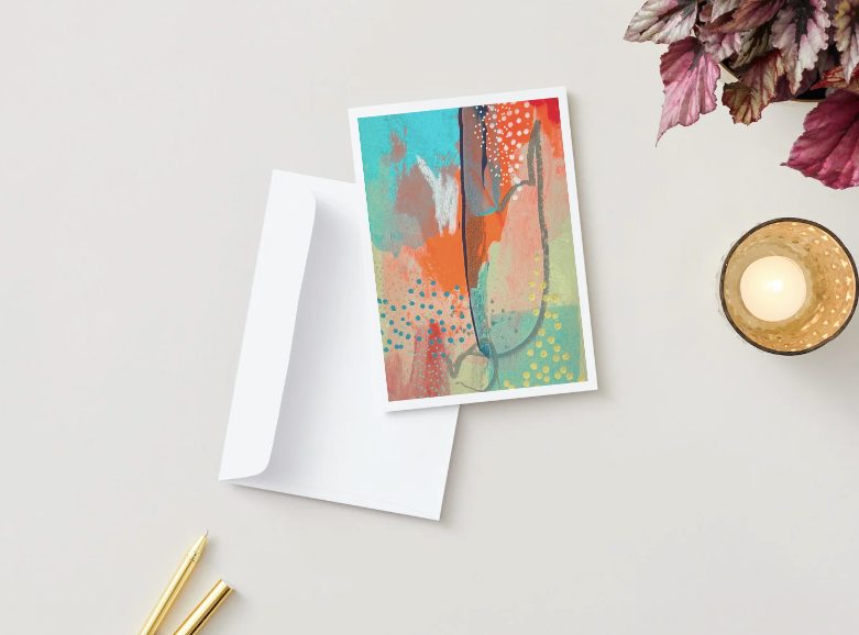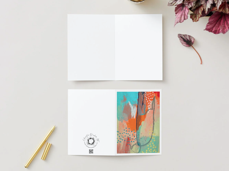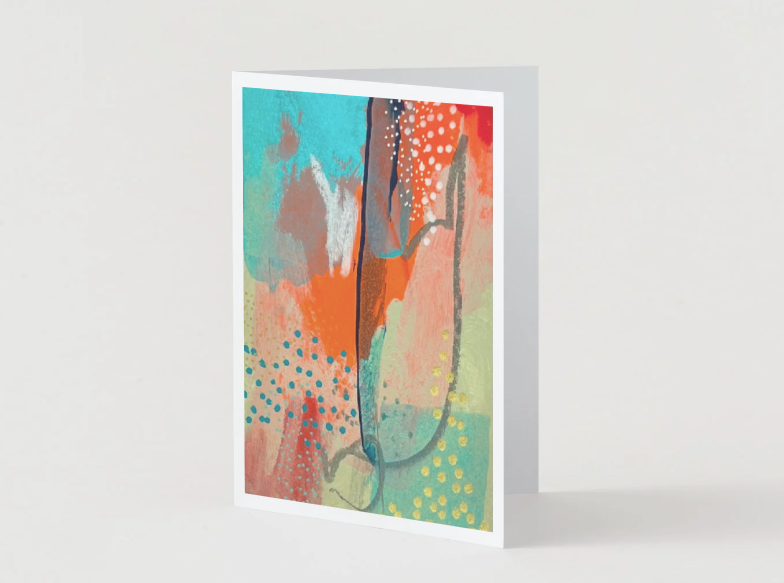 This printed card is adapted from one of my original hand-painted miniatures—a lively mix of coral reds, aqua blues, and golden accents that dance across the surface. Full of movement and light, it’s a little celebration in colour—perfect for joyful notes, thank-yous, or just-because messages.